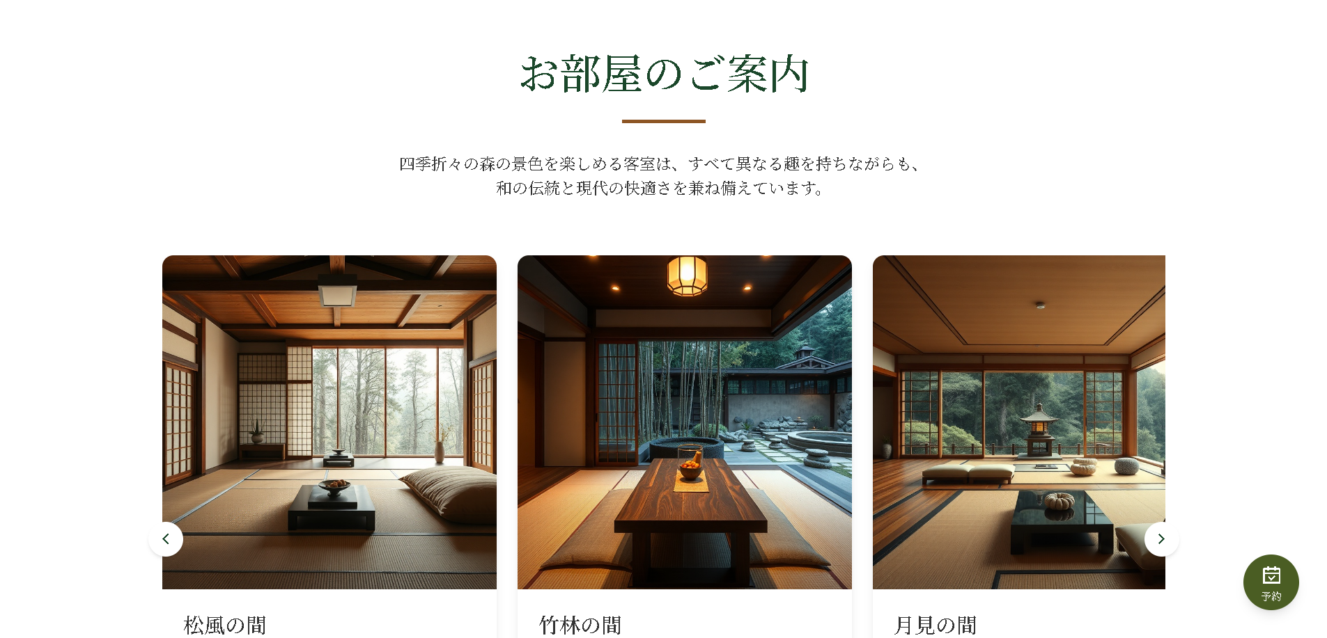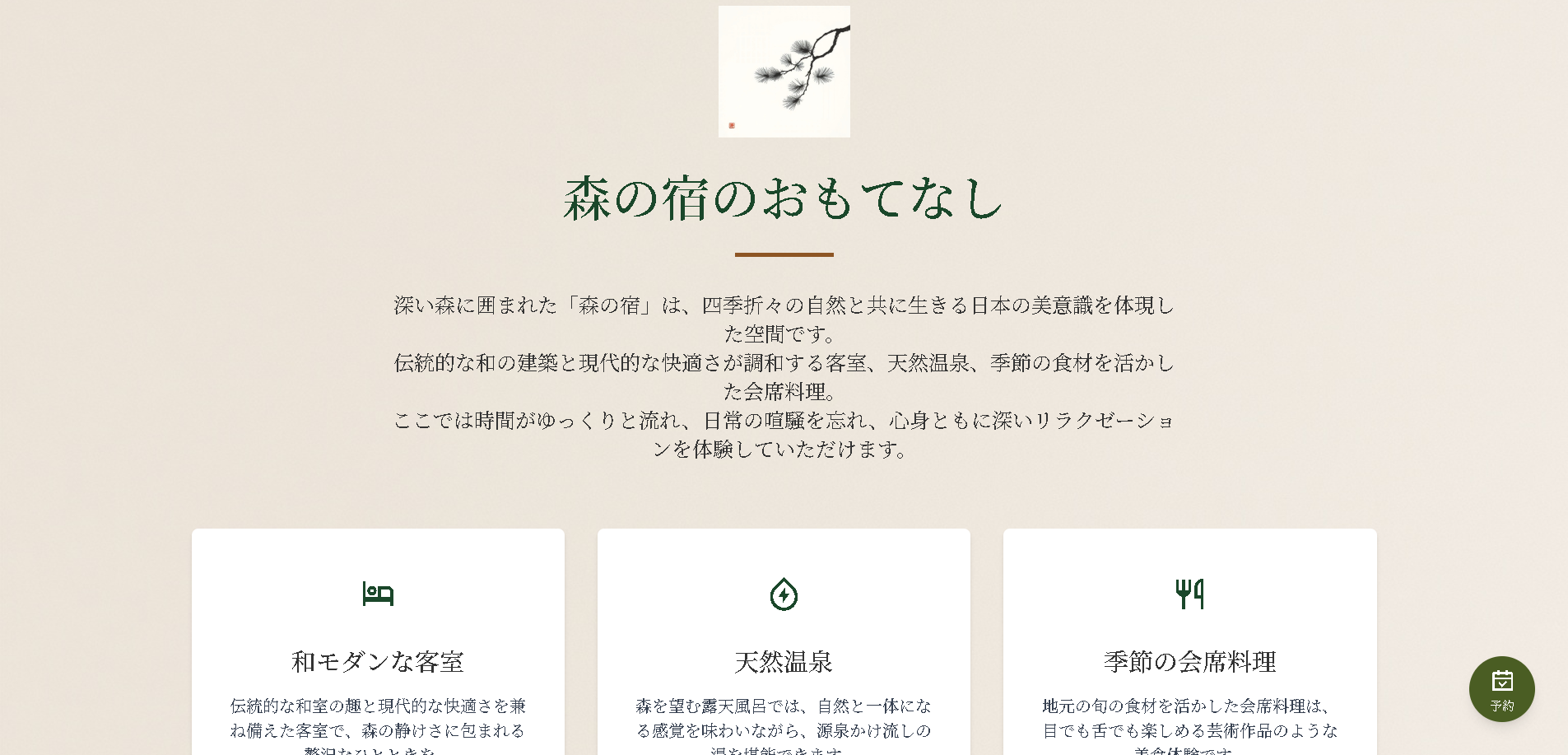 森の緑と自然光を活かした写真を大胆に配置。ミニマルなデザインで余白を生かし、静けさと癒しを視覚的に表現。予約ボタンは目立つ位置に配置し、コンバージョンを最優先した。