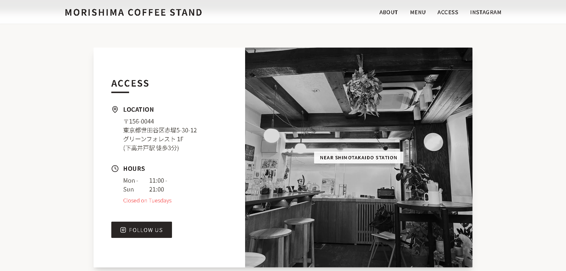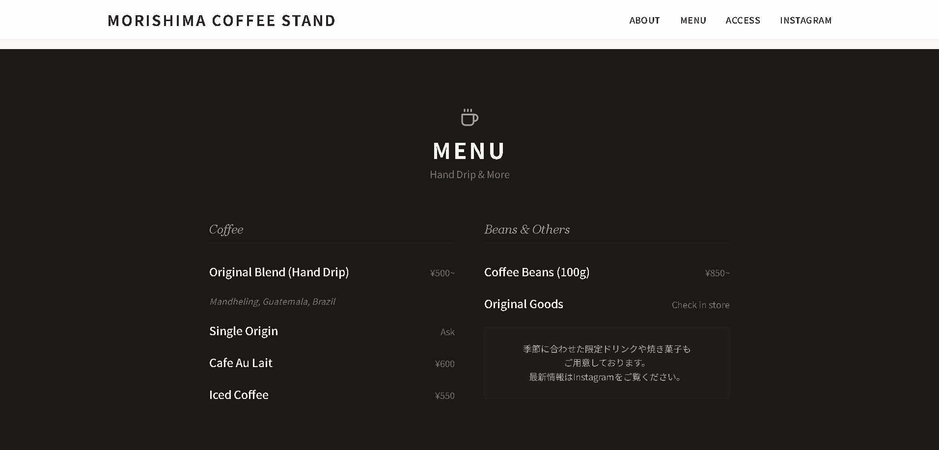 - ACCの「モリシー」がオーナーの音楽とコーヒーを楽しむコーヒースタンドのサイトを新規作成。ACCの持つ世界観とオーナーの持つ世界観、そしてお店のイメージを融合した。